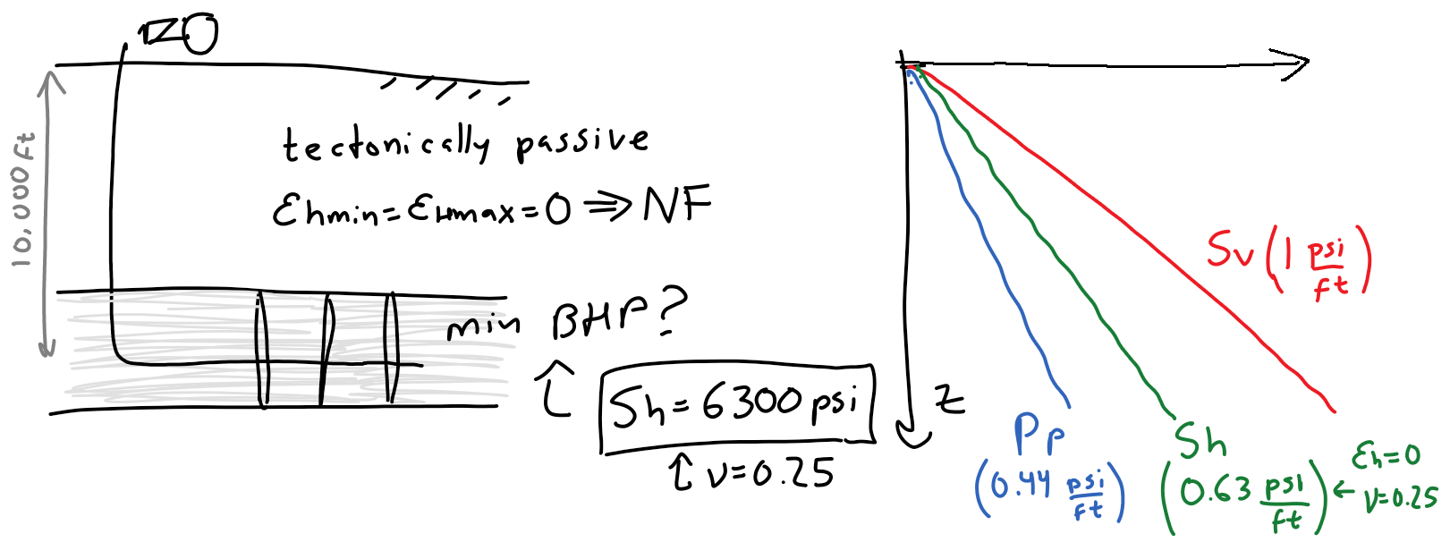 Compute effective and total stresses assuming there is overpressure with \(\lambda_p = 0.7\), tectonic strains are \(\varepsilon_{hmin} = 0\) and \(\varepsilon_{Hmax} = 0.0002\), and the shale Young’s modulus is \(E=5 \times 10^6\) psi.