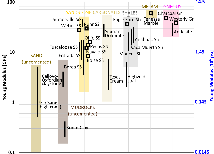 Fig. 57 Typical Young moduli for sediments and rocks. The values correspond to “quasi-static” loading from stress-strain response. SS: sandstone; SiS: Siltstone; Sh: Shale; Gr: Granite.#