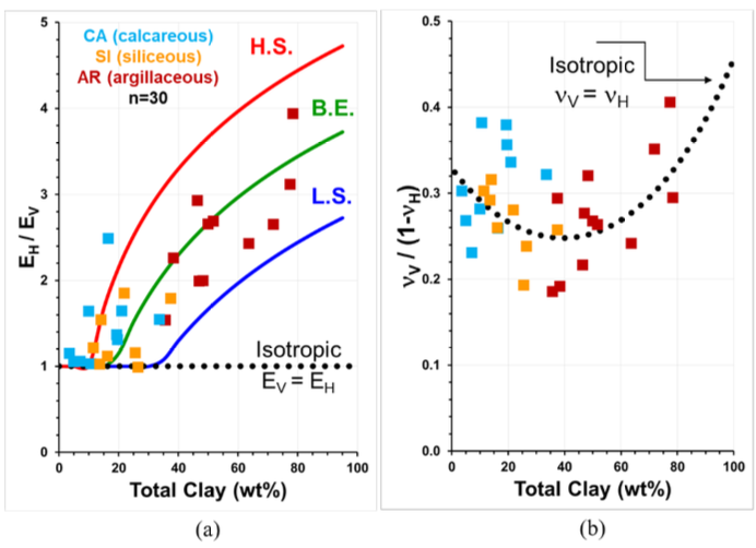 Fig. 67 Summary of experimental measurements of shale anisotropy. (a) Ratio of horizontal and vertical Young’s modulus and (b) coefficient of horizontal effective stress according to a vertical transverse isotropic model. Anisotropy increases with increasing clay and organic matter content in shales. Source: Crawford et al. 2020.#