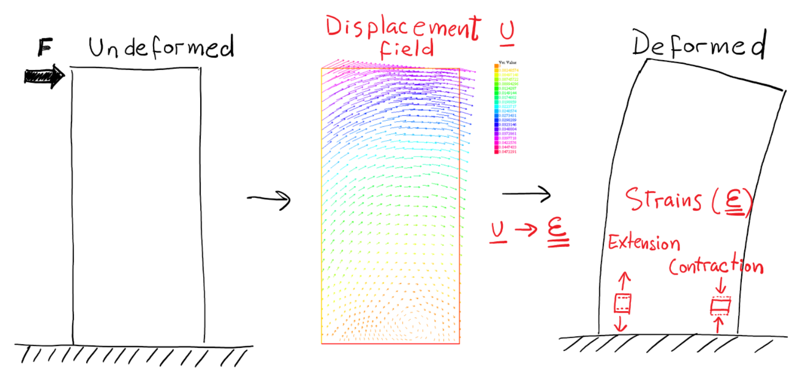 Applications of stresses result in solid deformation and displacements. Fig. 50 shows an example of a solid body and the corresponding displacement vector field (traces the displacements from the original to the deformed state). In this particular case, the solid is anchored at the bottom and deforms due to the application of a force (from left to right) on the top. Hence, displacements at the bottom are zero and displacements on the top are the maximum.