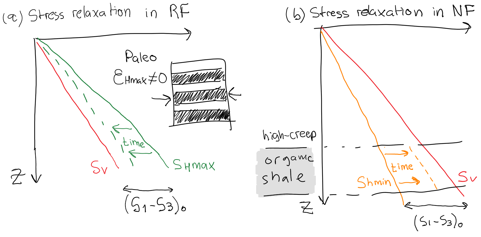 Fig. 72 Impact of stress relaxation in horizontal stresses in the subsurface. (a) Decrease of \(S_{Hmax}\) due to deviatoric stress (\(S_{Hmax} - S_v\) in this case) relaxation caused by a paleo-tectonic strain \(\varepsilon_{Hmax}\). (b)Increase of \(S_{hmin}\) due to deviatoric stress (\(S_v - S_{hmin}\) in this case) relaxation caused by overburden stress.#