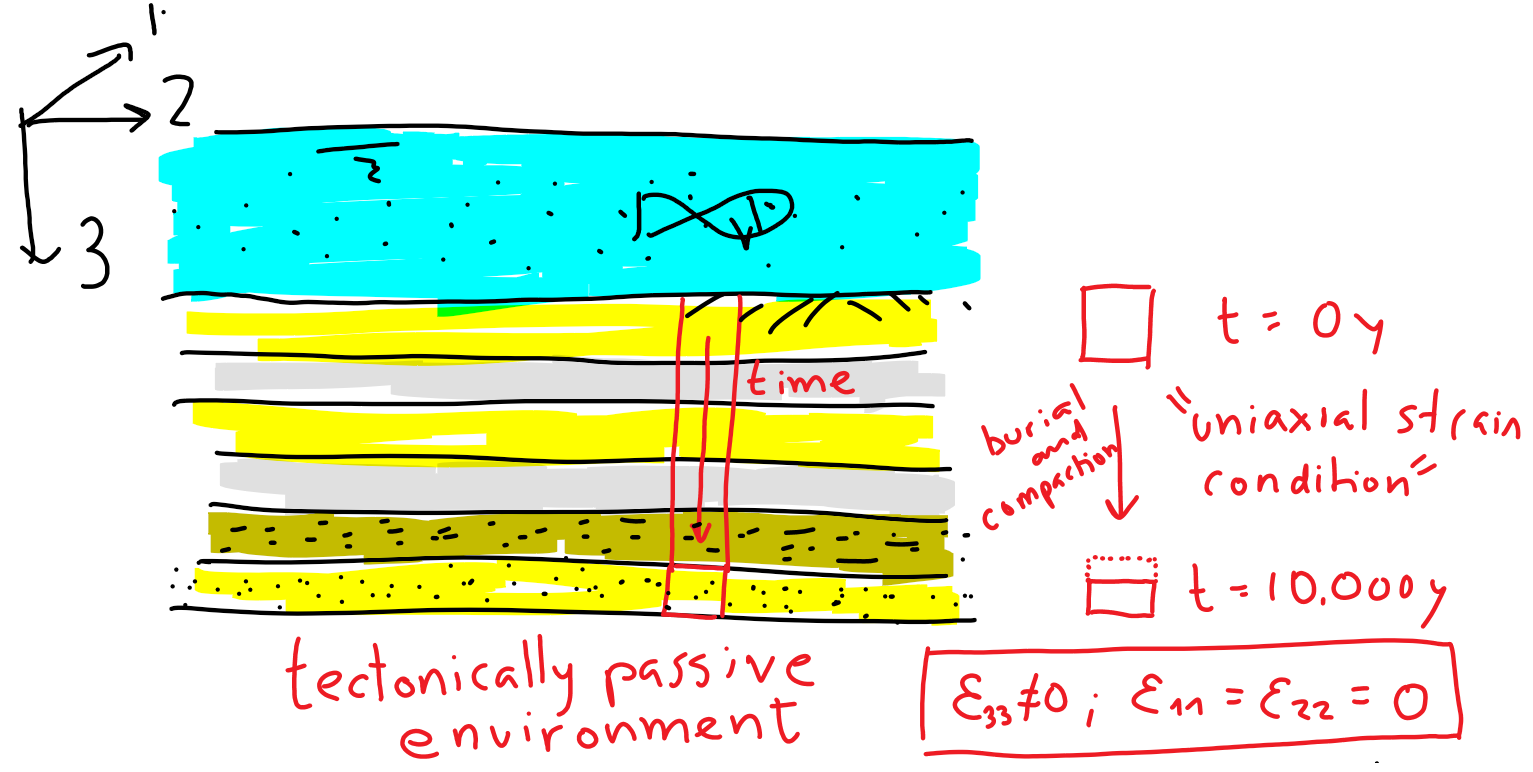 When rocks deform, most of the deformation transfers into changes of porosity. As a matter of fact, the solid phase can also deform and change volume. In that case the equation that links stresses and deformations \(\underset{=}{\varepsilon} = \underset{=}{D} \: \underset{=}{\sigma}\) needs to be corrected according to Biot’s effective stress: