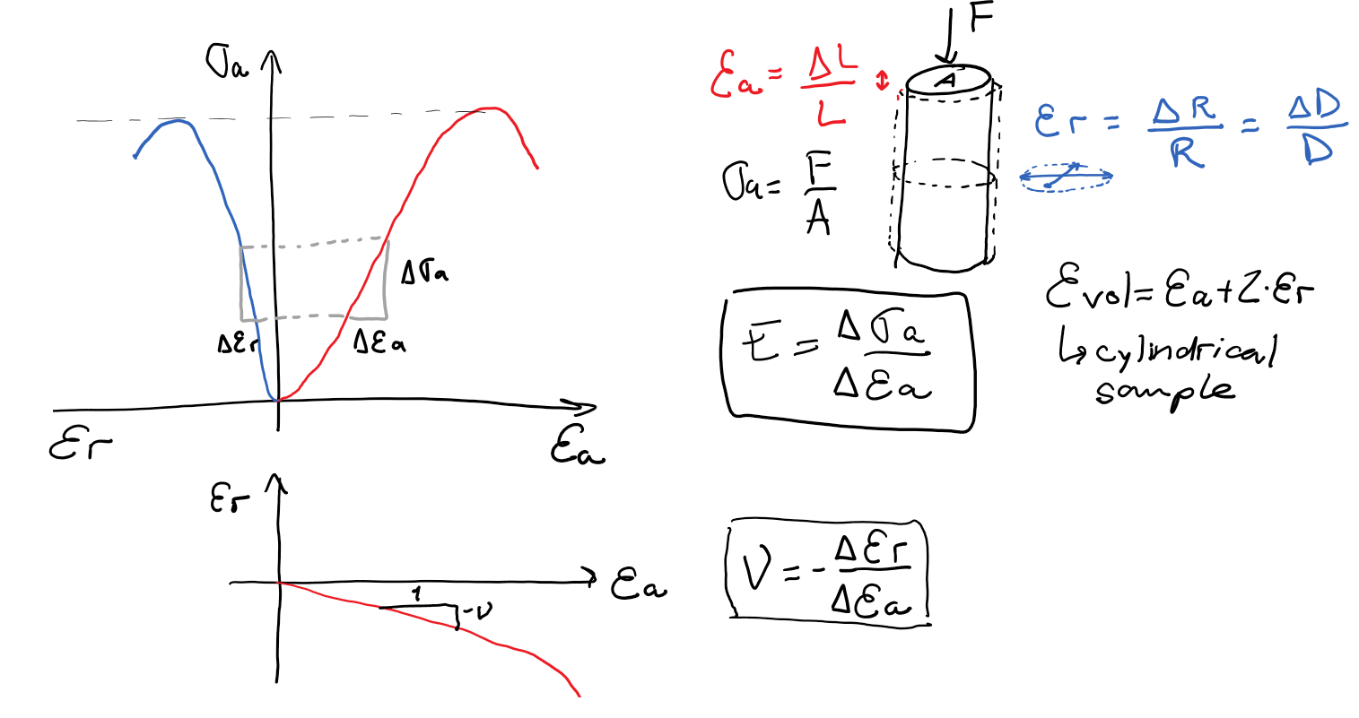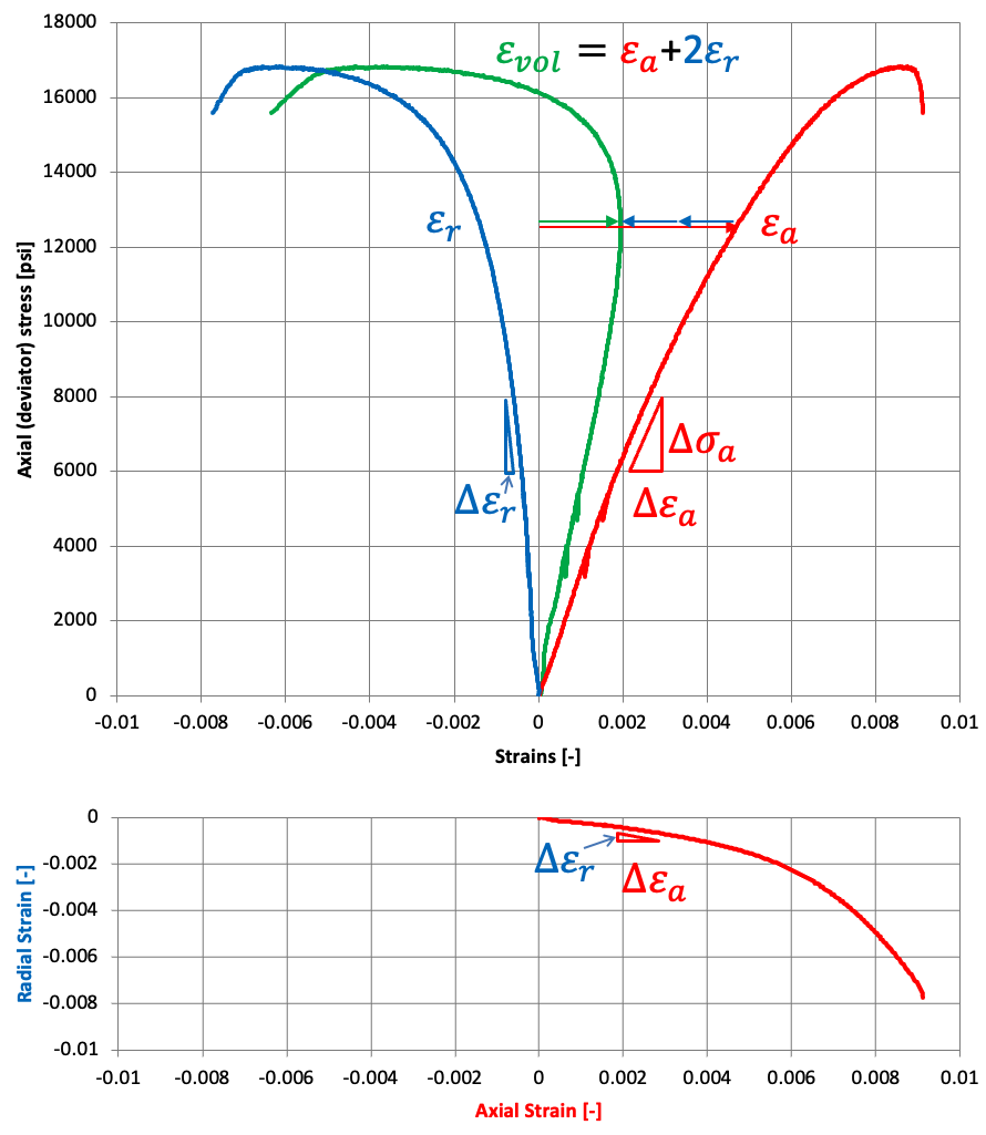 Fig. 56 Actual laboratory measured stress-strain response during rock axial (deviatoric \(\Delta \sigma_a\)) loading. Data analysis permits recovering the Young’s modulus and the Poisson’s ratio. The data clearly shows the transition of volumetric strain from positive to negative changes, which clearly shows rock damage before the peak failure stress. Elastic property measurement \(E\) and \(\nu\) should be done with minimum or no damage.#