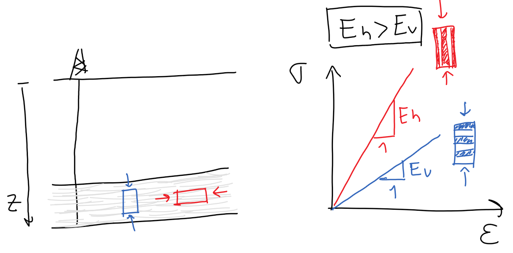 Most sedimentary rocks are stiffer in the horizontal direction than in the vertical direction \(E_h > E_v\).