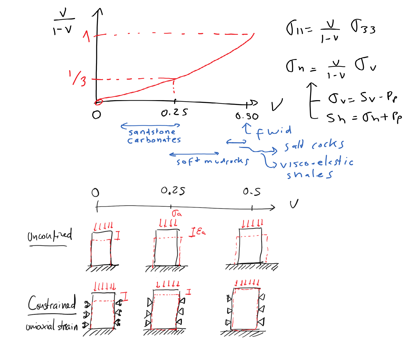Compute horizontal effective stresses assuming linear isotropic elasticity, \(\nu\)=0.22 and that horizontal strains are nearly zero.