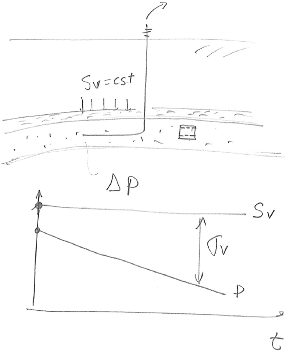 The equation above captures reservoir boundary conditions in which the total vertical stress \(S_v\) remains constant (overburden above the reservoir does not change) and there is no change of lateral strain \(\varepsilon_h\), a condition also termed as “uniaxial strain” deformation. Such condition is appropriate in long and thin reservoirs with a compliant caprock (Fig. 63).