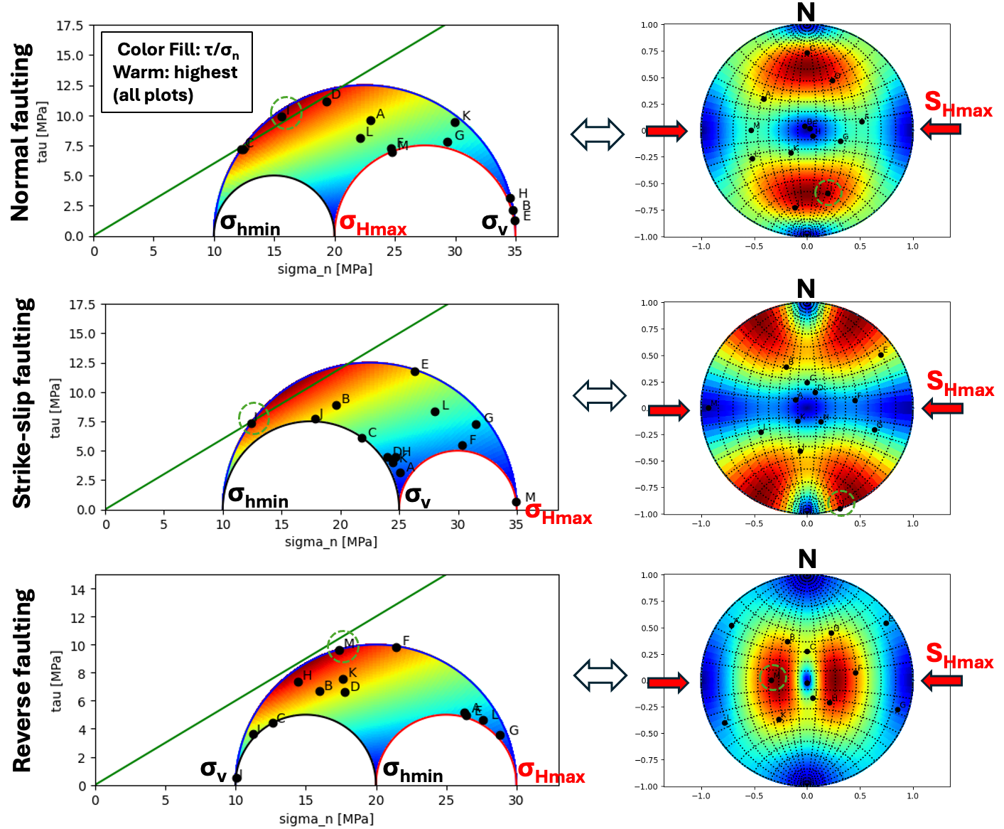 Fig. 133 Examples of fracture plane orientation and corresponding ratio \(\tau / \sigma_n\) and pole location in a stereo-net plot. The orientation of critically stressed fractures varies with faulting regime and principal horizontal stress orientation. This figure was created with the “Tensor method” based on python code initially written by Daniel Barrera (UT Austin BS student, class of 2020).#