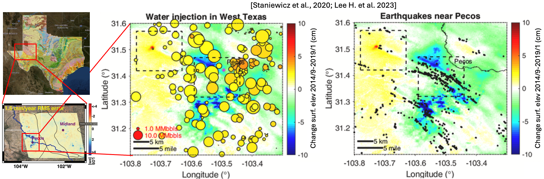Fig. 142 shows images relating salt-water disposal volumes, ground elevation change (discussed Chapter 8), and induced seismicity in the Delaware Basin near the city of Pecos.