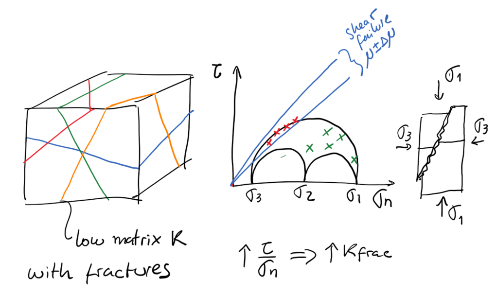 The previous section shows how to calculate the normal effective stress \(\sigma_n\) and shear stress \(\tau\) components on an arbitrary oriented plane given the in-situ state of stress. A critically-stressed fracture (or fault) has shear stress and normal effective stress components with a ratio \(\tau/\sigma_n\) which approaches the friction coefficient \(\mu \sim\) 0.6-1.0. The fracture is said to be ``critically stressed’’ because it is practically failing in shear. Such fractures -if they exhibit dilation during sliding- tend to be more hydraulically conductive than fractures with low \(\tau/\sigma_n\) ratio (on the right of the Mohr circle and far left close to \(\sigma_3\) - Fig. 132). Natural fractures can help fluid drainage. Traditionally, fracture permeability has been thought to be dependent on effective normal stress only \(k_{frac} = f(\sigma_n)\). The concept of critically stressed fractures adds one more level of dependency to fracture permeability such that it is also a function of shear stress \(k_{frac} = f(\sigma_n,\tau)\).