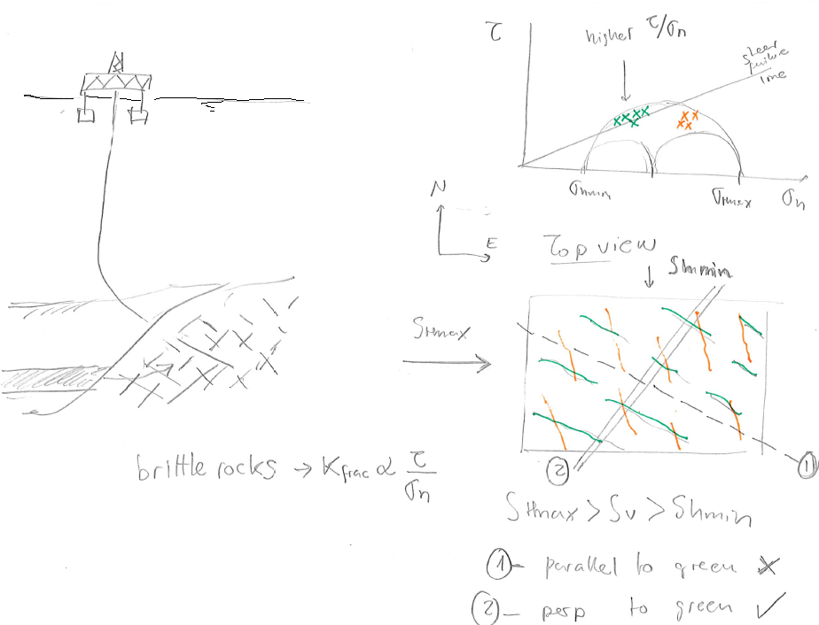 If critically oriented fractures have higher permeability than non-critically oriented fractures, then, the state of stress determines which fractures are hydraulically conductive and also determines permeability anisotropy in a fractured reservoir. Fractures that have an orientation that favors high \(\tau/\sigma_n\) ratio are said to be “critically oriented” Fig. 132. This dependence is particularly important in unconventional formations where fracture permeability plays a critical role in determining production rates. The orientation of such fractures is critical for determining the orientation of a horizontal wellbore that minimizes the least resistance path of fluids from the rock matrix to the wellbore.
