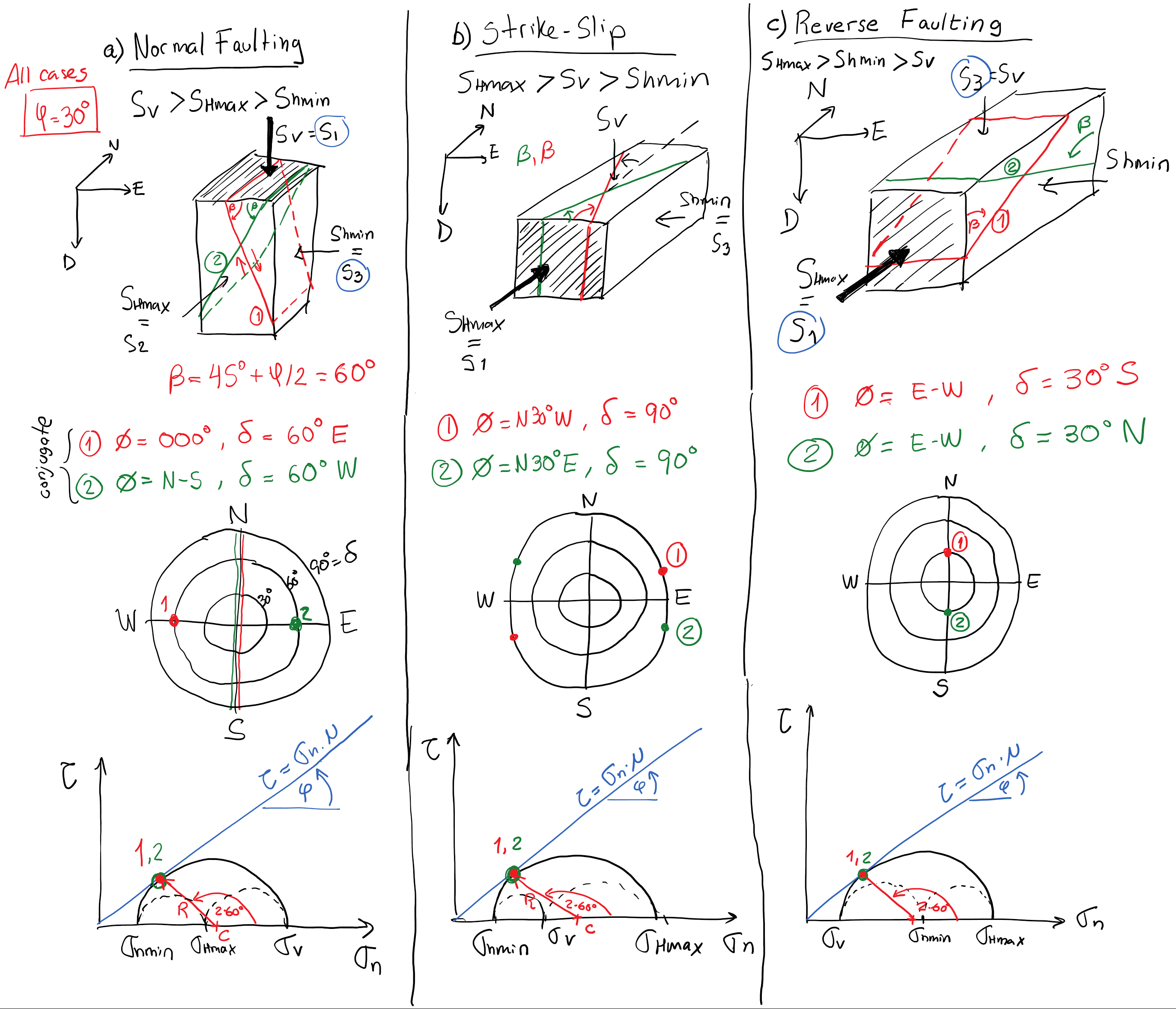 In a given reservoir under study, stresses are \(S_{hmin}=\) 40 MPa, \(S_{Hmax}=60\) MPa, \(S_v=45\) MPa, \(P_p= 20\) MPa, and \(S_{hmin}\) acts E-W. For each of the faults below, calculate (using the 3D Mohr circle method if possible) the normal and shear stress on the plane of the fault and then determine if the fault is prone to slip assuming \(\mu = 0.6\).