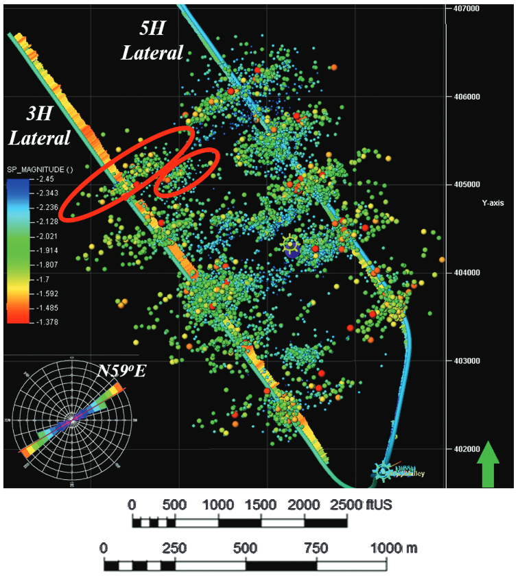 Fig. 131 Shear fracture reactivation in multistage hydraulic fracturing evidenced by microseismic activity - Image from Wilson et al. 2018 - Interpretation#