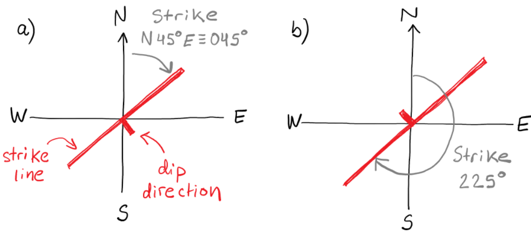 “045\(^{\circ}\)” for a a fault strike N45\(^{\circ}\)E and dipping SE.