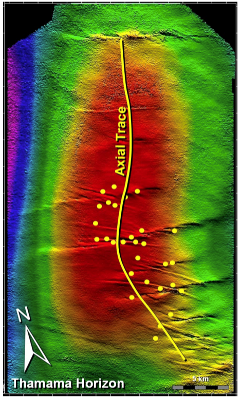 Fig. 140 Seismic image of the top of an anticline structure (red: shallower, blue: deeper, TOP VIEW). The discontinuities in the seismic image are strike-slip faults. Image from IPTC-10646-MS.#