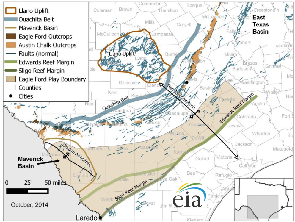 The following figure shows major faults in the Eagle Ford region [EIA, 2014 - Updates to the EIA Eagle Ford Play Maps].