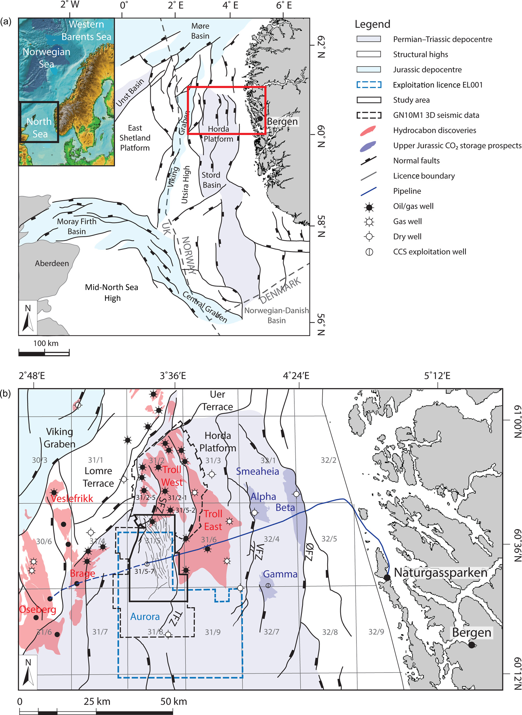 Fig. 111 Geological map of the North Sea highlighting the strike of normal faults around oil and gas fields, and formations targeted for carbon geological storage. Figure credit#