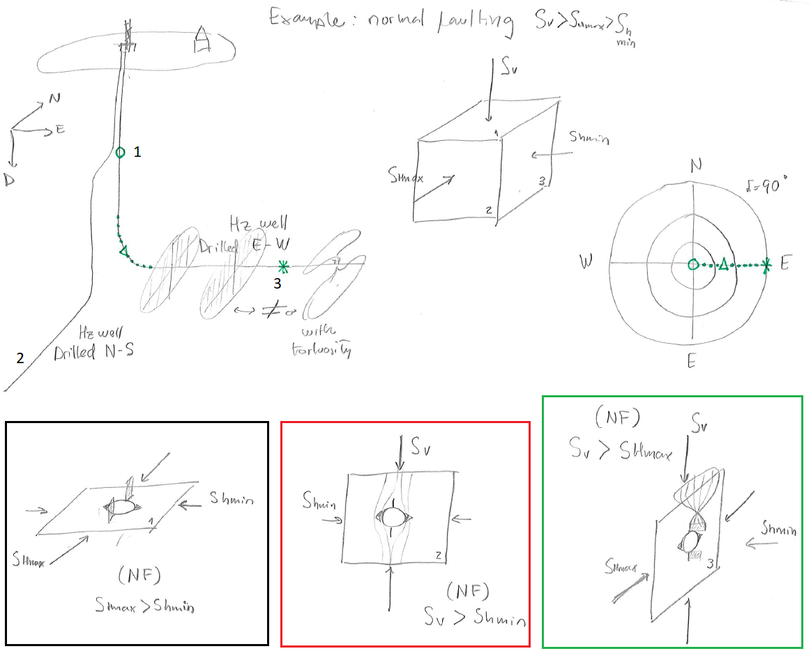 Consider a place where vertical stress \(S_v\) is a principal stress and the maximum horizontal stress acts in E-W direction.