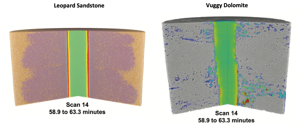 Fig. 149 Examples of mud buildup (warm colors) and filtrate/leak-off (cool colors) in two different rock samples as imaged trough time-lapse X-ray tomography. The buildup of mud with time makes the mudcake or filtercake. Image credit.#