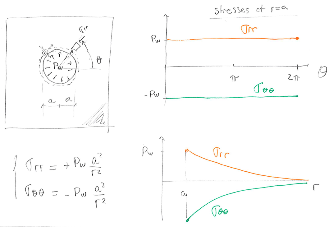Let us obtain \(\sigma_{rr}\) and \(\sigma_{\theta \theta}\) at the wellbore wall \(r=a\). The radial stress for all \(\theta\) is