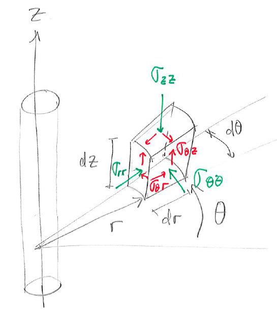 where \(\sigma_{rr}\) is the radial effective stress, \(\sigma_{\theta \theta}\) is the tangential (hoop) effective stress, \(\sigma_{r\theta}\) is the shear stress in a plane perpendicular to \(r\) in tangential direction \(\theta\), and \(\sigma_{zz}\) is the vertical effective stress in direction \(z\).