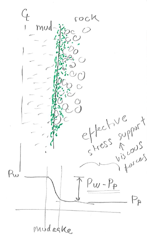 So far we have assumed that the radial effective stress at the wellbore wall is \(\sigma_{rr} = P_W - P_p\). Such assumption implies a perfect and sharp “mudcake” that creates a sharp gradient between the mud pressure and the pore pressure, such that, viscous forces apply an effective stress \(\sigma_{rr} = P_W - P_p\) on the wellbore wall (Fig. 148). However, mud water leak off and mud filtration can occur over time decreasing the sharpness of such gradient and reducing the effective stresses in the near wellbore region. A reduction of effective stress lowers the strength of rock and favors rock failure around the wellbore.