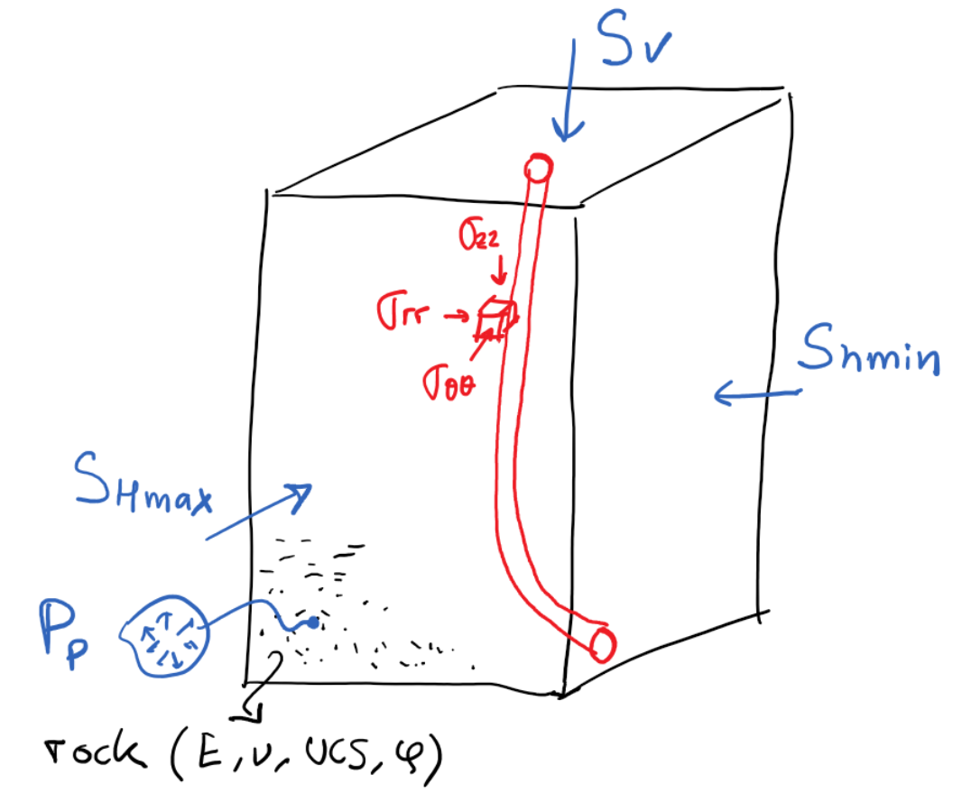 Consider a vertical wellbore subjected to horizontal stresses \(S_{Hmax}\) and \(S_{hmin}\), both principal stresses, vertical stress \(S_v\), pore pressure \(P_p\), and wellbore pressure \(P_W\). The corresponding effective in-situ stresses are \(\sigma_{Hmax}\), \(\sigma_{hmin}\), and \(\sigma_v\). The Kirsch solution for a wellbore with radius \(a\) within a linear elastic and isotropic solid is: