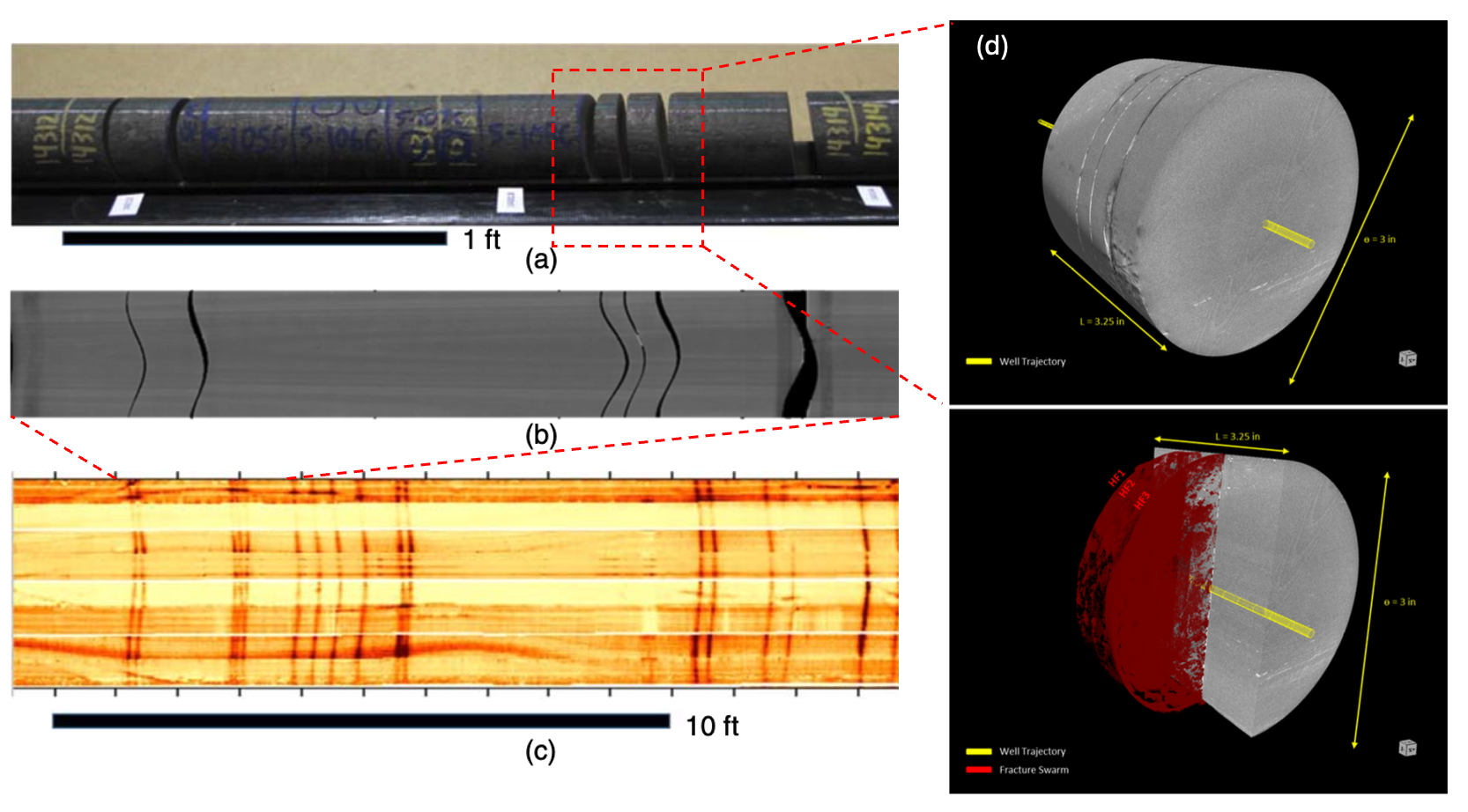 Fig. 222 Example of hydraulic fractures observed in cores retrieved from hydraulically fractured shales. Opposite to the common conception, multiple closely-spaced and semi-parallel fractures occur from a single cluster. These sets of fractures are usually referred as “fracture swarms” and the region where they preferentially propagate as “fracture corridor”. The fracture corridor usually stays localized and obeys perpendicularity to the least principal stress. Subfigures a, b and c are: actual photo, unwrapped CT radial scan, and unwrapped borehole image from an example in the Eagle Ford shale (Image credit). Subfigure d shows a 3-fracture swarm from the Wolfcamp Shale in the Delaware Basin, where the bottom image shows digitally highlighted fractures (Image credit).#