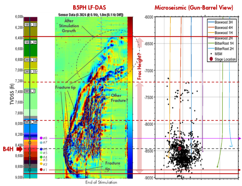 Fig. 220 Comparison of optical fiber and microseismic monitoring in a vertical cross section during stimulation of well B4H at HFTS2. The microseismic cloud (right) indicates stress perturbations up to 7,200 ft TVDSS, yet microseismic activity cannot conclusively tell whether this is a hydraulic fracture or “dry” shear reactivation only. The optical fiber shows significant strains along a vertical monitoring well B5PH up to 6,400 ft TVDSS. The monitoring suggest “buoyant” hydraulic fracture growth up to 2,000 ft above the stimulation depth, growing aseismically from 7,200 to 6,400 ft TVDSS. Image credit: urtec-2021-5396 and DOE_NETL.#