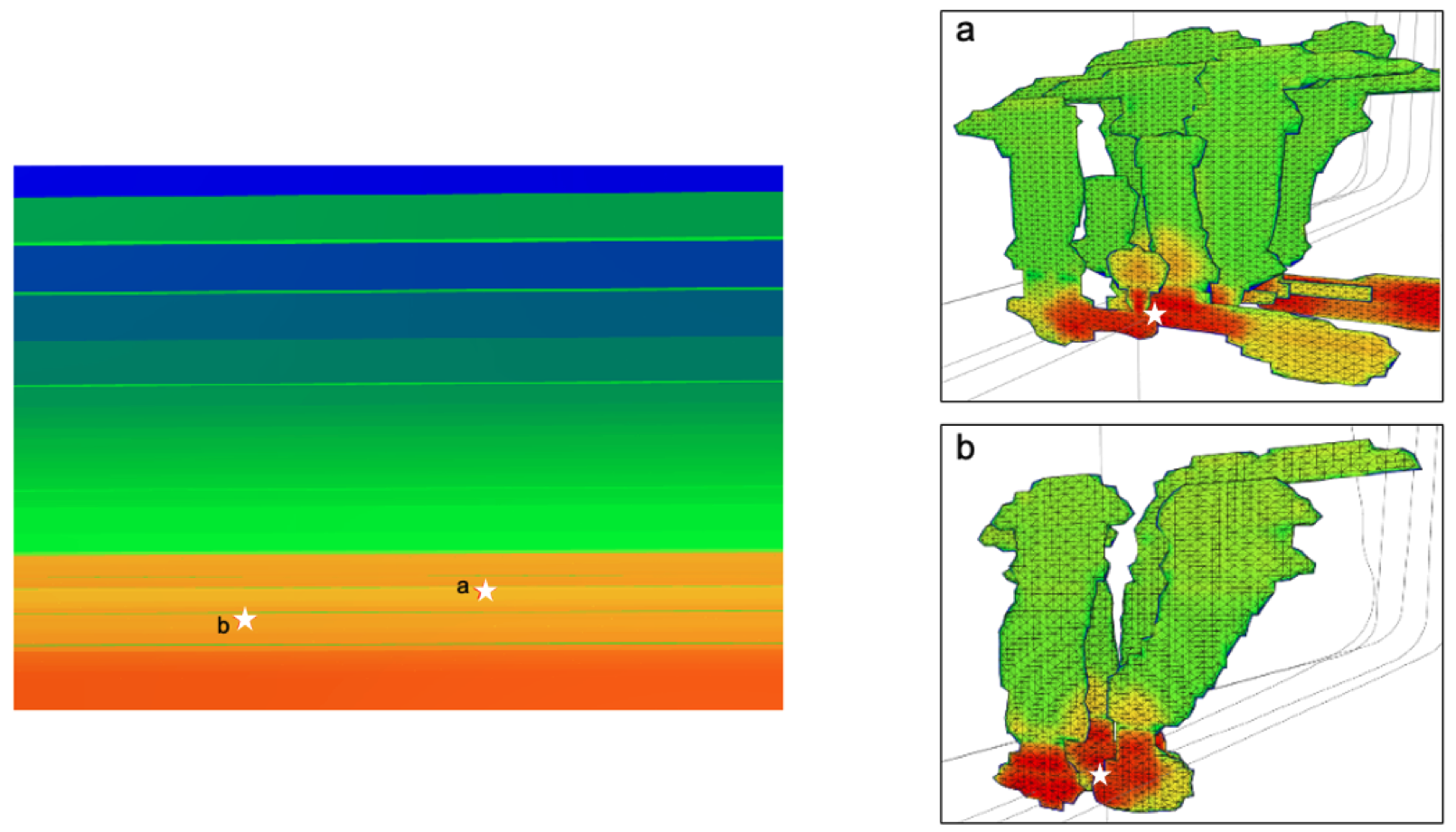 Fig. 221 Simulation example of a buoyant hydraulic fracture, where well landing and stimulation depths a and b (left figure), result in fractures propagating preferential upwards (right figures) into layers of lower minimum horizontal stress \(S_{hmin}\) (in green in left figure). Te fractures grow upwards until partially stopped by the local fracture barrier (blue layers) and pumping stops. The variation of stresses with depth and across lithological units is usually known as mechanical stratigraphy. Image credit. Simulation software: ResFrac.#