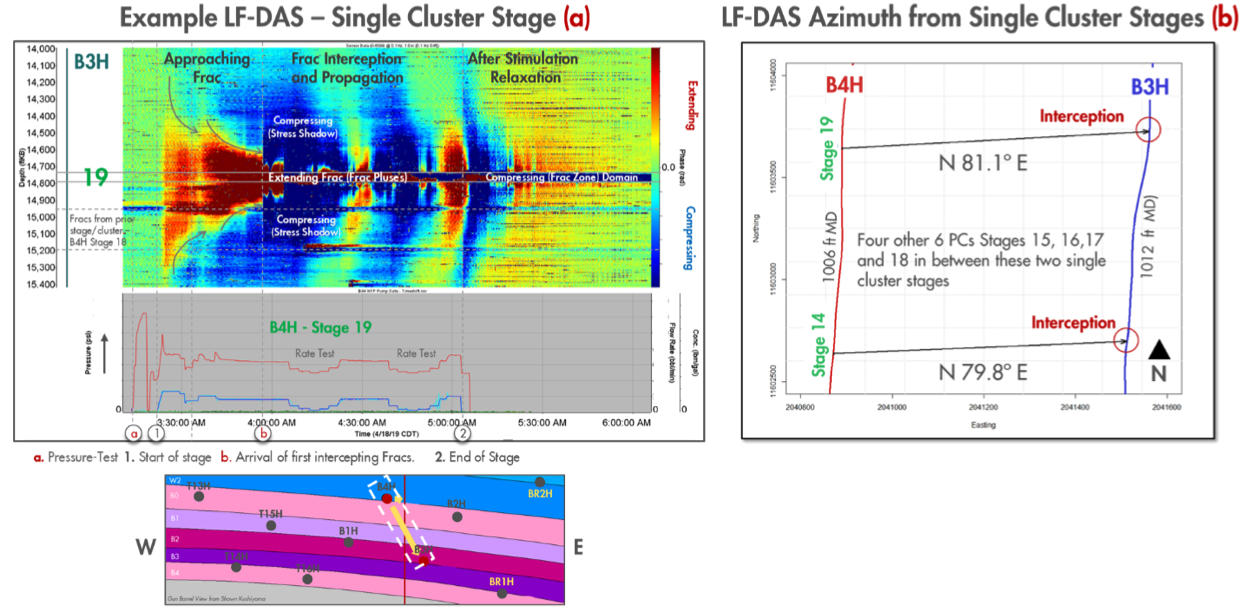 Fig. 219 Example of optical fiber monitoring for hydraulic fracturing. In this example, Stage 19 in well B4H is fractured, and fiber installed along well B3H detects its arrival by fiber stretching and contraction. The plot shows strain changes from MD 14,000 to 15,400 ft (vertical axis although it is horizontal length) with time (horizontal axis). The hydraulic fracture stretches the rock and fiber at the observation well as the tip approaches (red color). The fiber contracts when the fracture tip has passed or the stimulation finishes. Image credit: urtec-2021-5396 and DOE_NETL.#