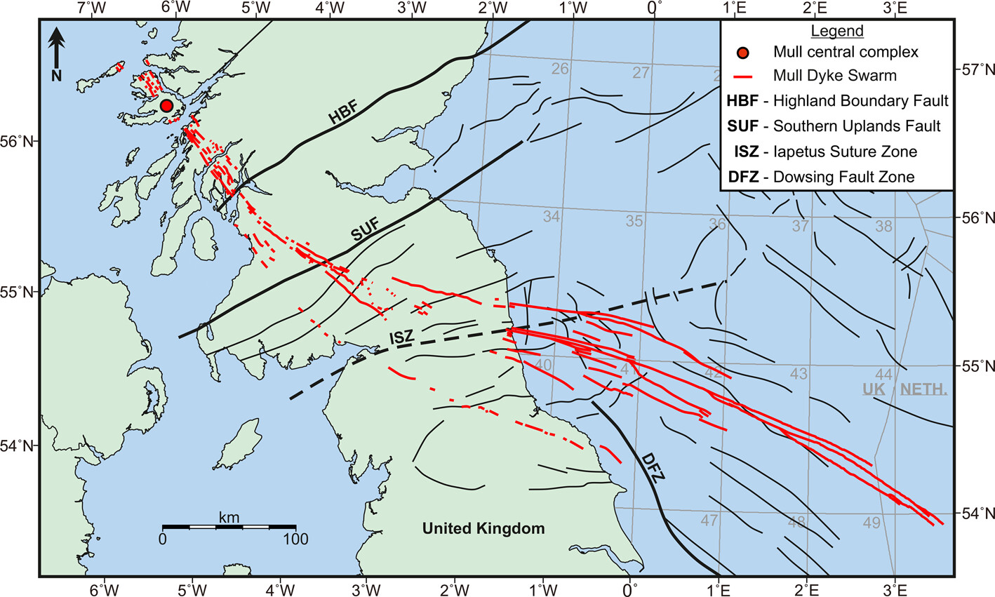 Fig. 183 Recent improved mapping of the Mull Dyke swarm in the UK. 100-km long dykes cross through sedimentary basins with great economic value (Image credit).#