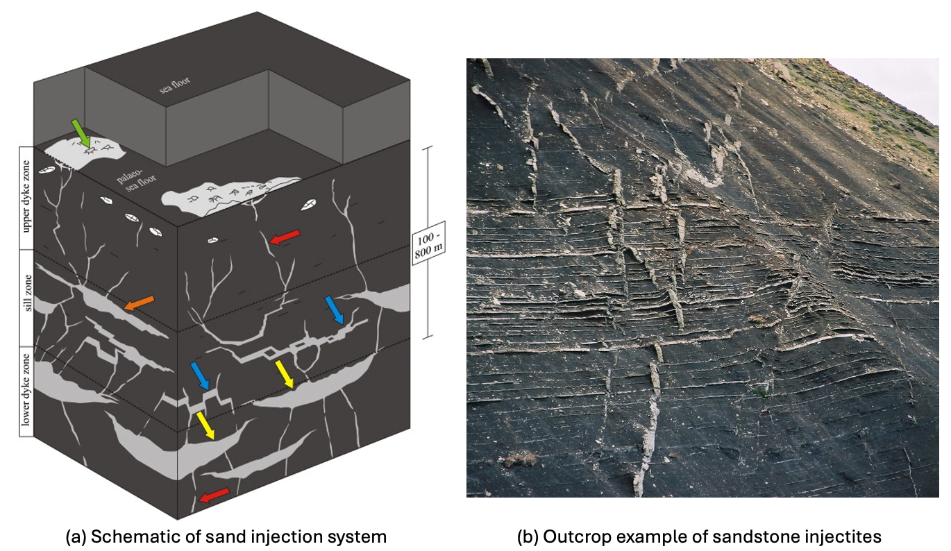 Fig. 185 Sand injectites schematic (a, image credit) and outcrop example in Patagonia (b, image credit), sand horizontal thickness is about 10cm.#