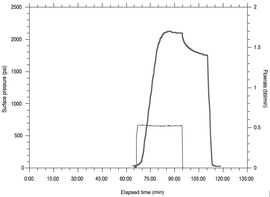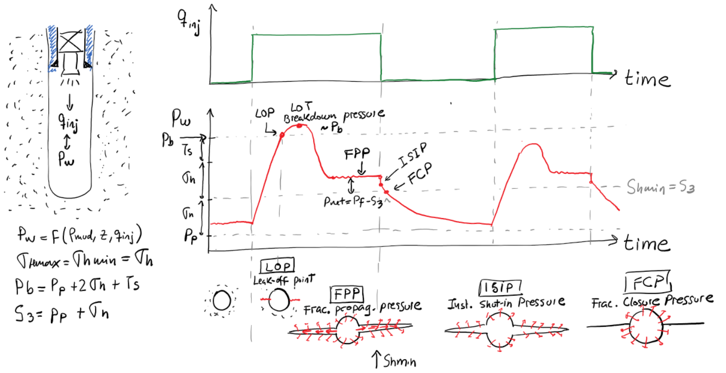 Injection of drilling mud at a constant rate causes the pressure to increase up to a maximum that depends on the near-wellbore stresses and tensile strength of the rock (Fracture breakdown pressure FBP or \(P_b\)). A change of slope may occur before FBP indicating a change of cavity volume, known as leak-off point (LOP).