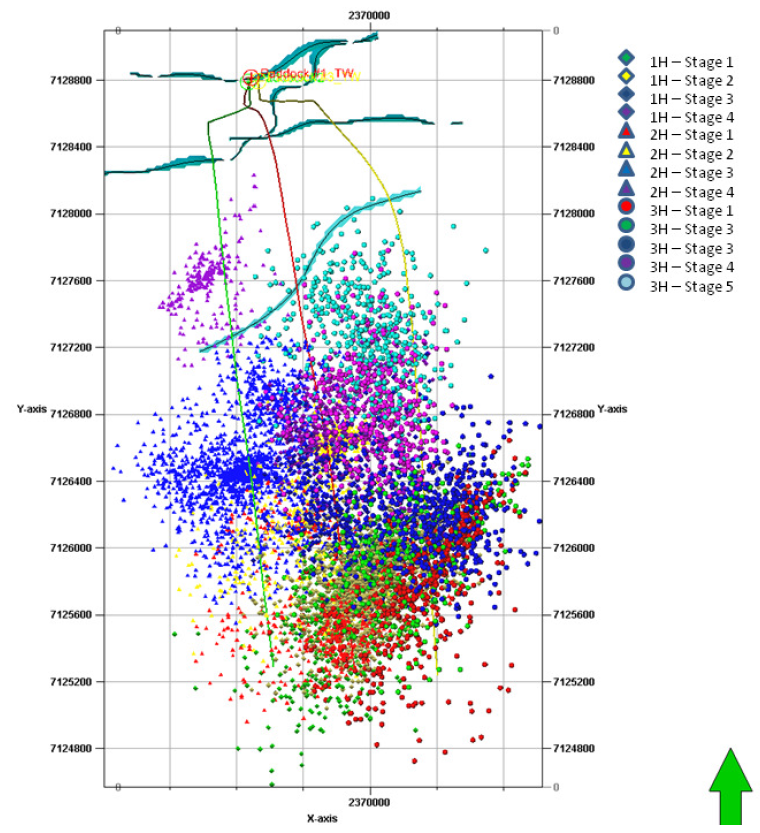 Fig. 228 Caption from original publication “Stimulation process performed on the three horizontal wells using plug-and-perf and slickwater treatment with fault traces mapped at laterals depth interval in cyan. The zipper-style frac performed on the 1H (central well in red) and the 3H (east well in yellow) was monitored from 2H (west well in green). The four stimulation stages performed on the 2H were monitored from the 3H.”#
