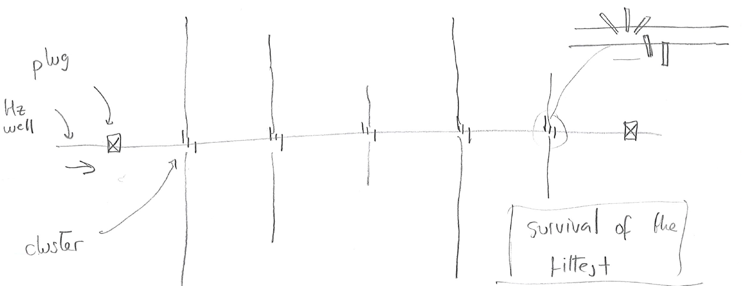 Recent completion designs give more “freedom” to fractures to develop by placing multiple perforation clusters in a single stage (Fig. 215). This design is called “multicluster fracturing”. The result is that fractures compete with each other to grow in the relatively close to each other. Sometimes, stress interference may halt the propagation of nearby fractures resulting in long and short fractures. In some sense, this design favors “survival of the fittest” rather than enforcing a given spacing between fractures.