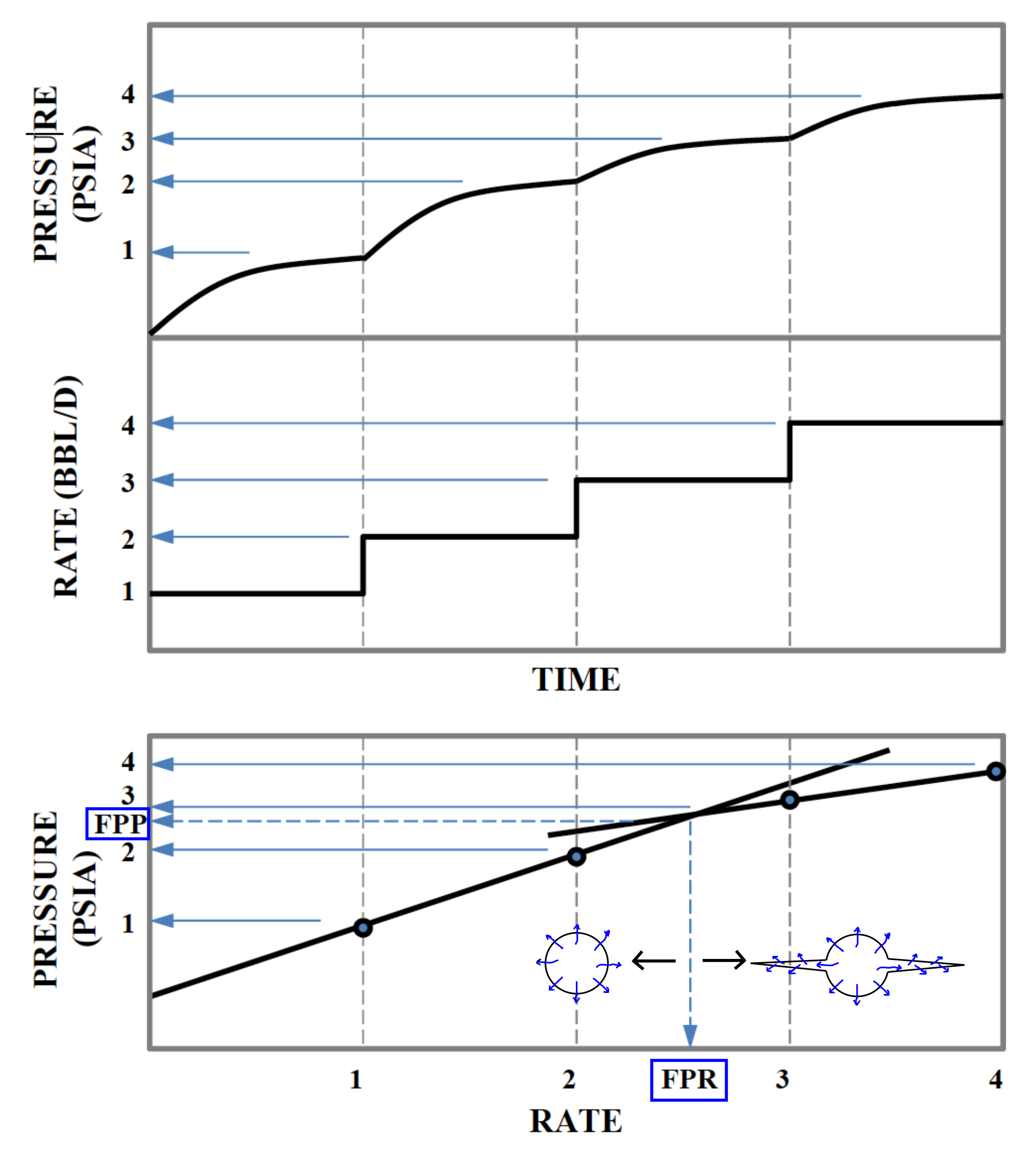 Fig. 194 Schematic procedure of an ideal step-rate test. FPR: fracture propagation rate. FPP: formation parting pressure. Notice that the acronym is the same as the Fracture Propagation Pressure in previous subsections, but they refer to different physical processes. Modified from [SPE 169513].#