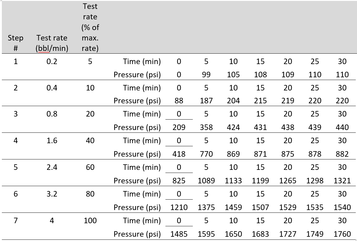 The step rate test helps determine the maximum injection pressure in a wellbore designed for constant and long-term injection. Examples of injected fluids include water (liquid or vapor), CO\(_2\), N\(_2\), polymer mixtures, foam, natural gas, and produced water, among others. The objective is to determine the maximum injection pressure known as “formation parting pressure”.