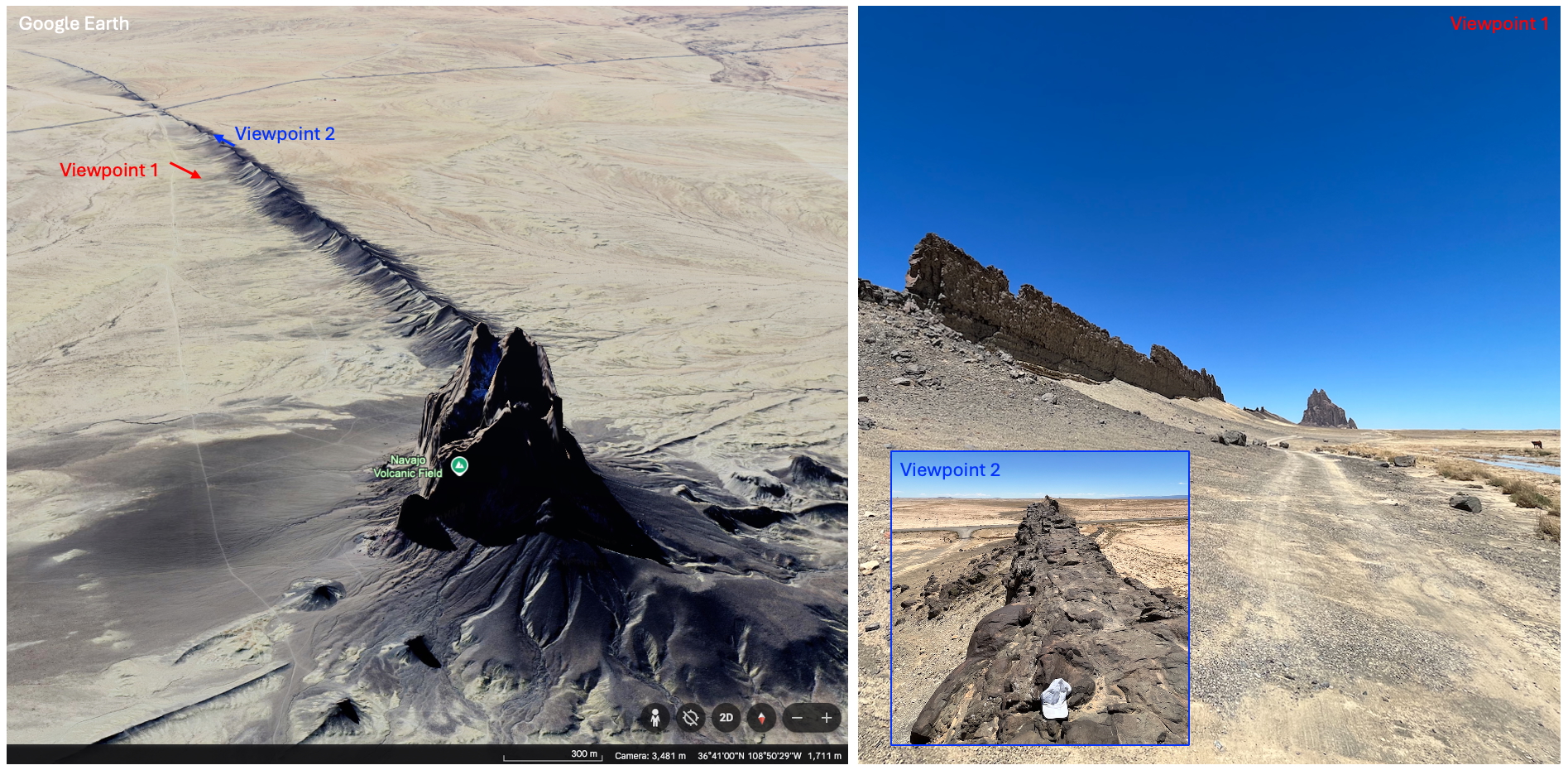 Fig. 184 The shiprock dike is a great example of magmatic dikes. The hard igneous rock has resisted weathering and remains now exposed. The dike width can reach a few meters (~1 to 3m) on surface and elevates up to ~15 m from today’s ground surface (Take a bird’s-eye tour with Google Earth).#